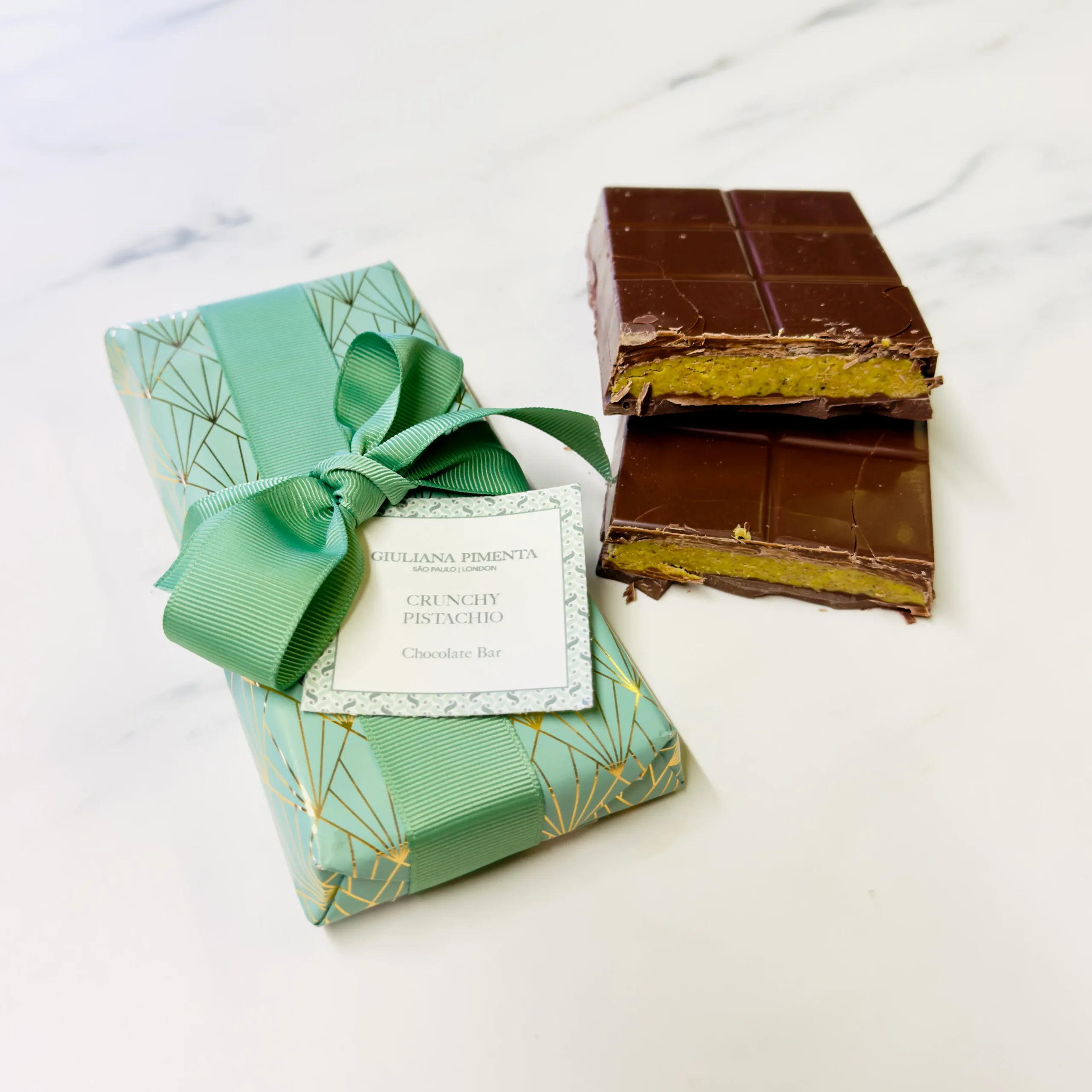 Experimente la perfecta armonía de texturas y sabores en nuestro Barrita de chocolate con pistacho crujiente. Fabricado con rico chocolate con leche 41% y profusamente lleno de ganache crujiente de pistacho, Elaborado con pistachos tostados y barquillo caramelizado para darle profundidad, textura crujiente y autenticidad.